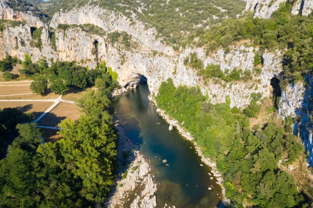 La mini-descente tôt le matin : 6 km de Vallon à Chames, départ à partir de 9h avant la foule. On passe sous le Pont d’Arc quasi seul, et on profite des plages désertes du haut des gorges.